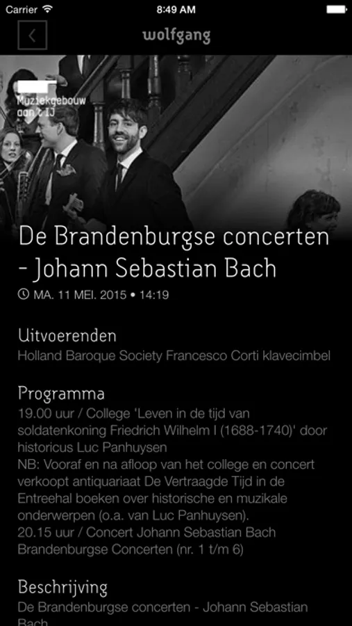 Wolfgang is a smartphone app for live classical music. The app can be used during concerts, but also at home. Wolfgang tells you in real-time about the music being performed. While the orchestra is playing, Wolfgang makes you hear what is happening -- at the very moment -- in the music.