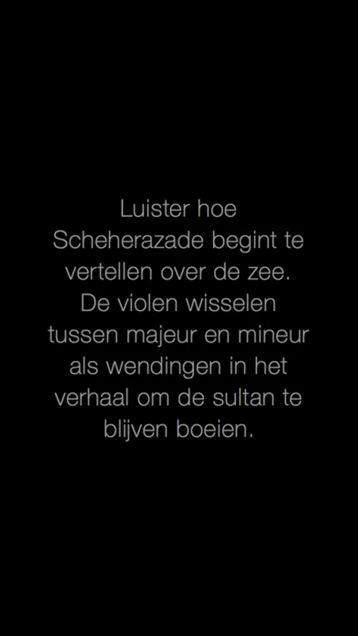 Start the app before the concert and put your phone on silent. This way, Wolfgang won't disturb anyone. As the orchestra begins, Wolfgang will commence explaining what you hear using short, well-timed text sentences. Wolfgang narrates leisurely, you only need to glance occasionally at your smartphone. You have ample time to look at the orchestra and enjoy the music. Put your phone on your lap, if you like.