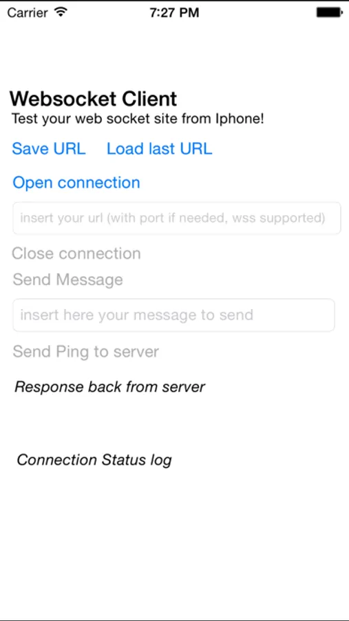 A easy client to test your web socket server/site, simply insert your url (can be used url as HTTP, WS, WSS secure connections) insert the specific port, if necessary, and test it!