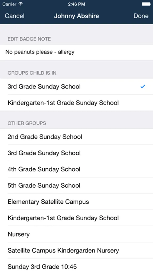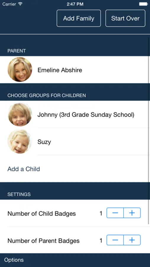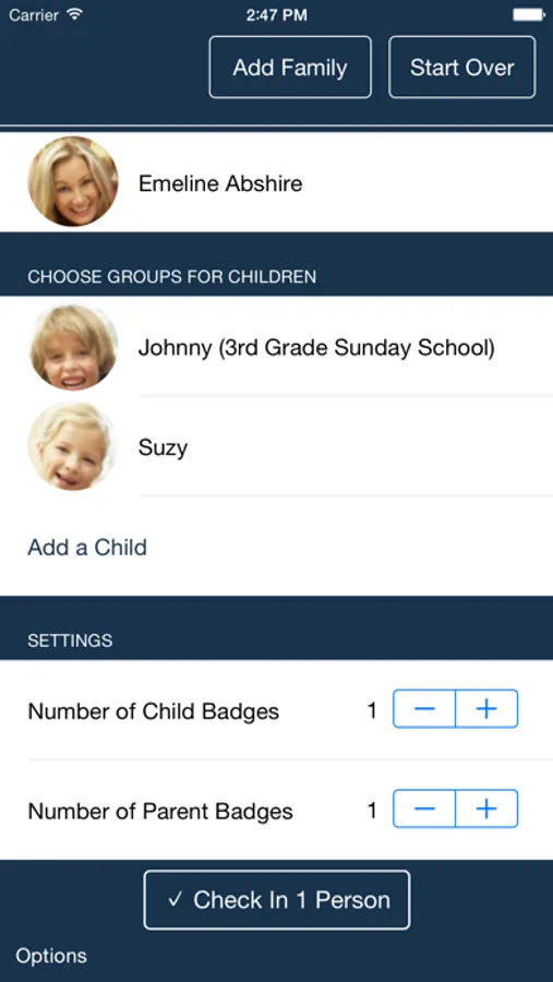 You can choose the group to check each person into, add new children and families, and edit the notes that print on the badges.