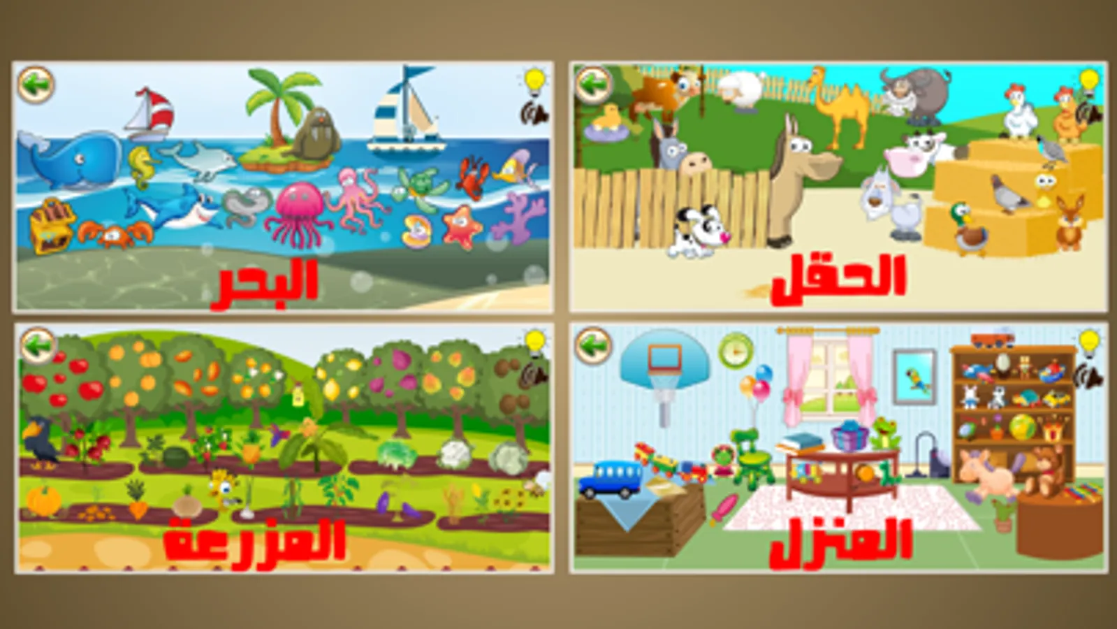 2- خلفيات مختلفة و متنوعة تمثل بيئات مختلفة : الغابة - الحقل - المطبخ - البحر - حجرة طفل