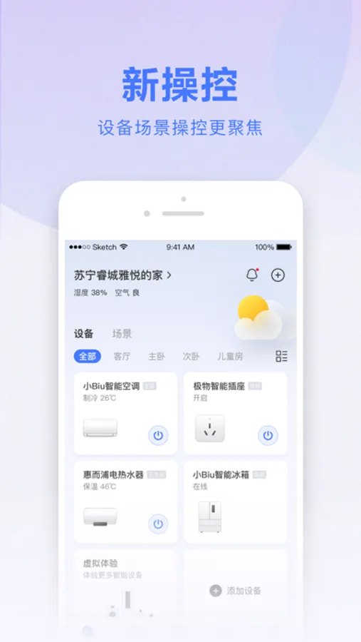 2.统一管理,方便快捷。在苏宁易购上购买的智能产品,都可以使用小Biu智家统一管理。设备状态,一手掌握。