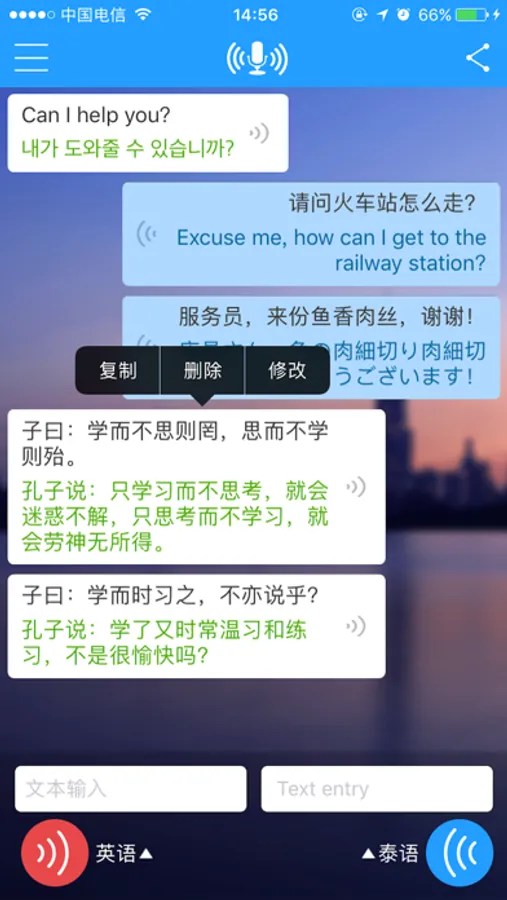 提供语音与文字的实时双向互译功能,支持中文、英语、粤语、法语、日语、德语、韩语等47种语言翻译,陪你轻松走遍世界的每一个角落,帮你跟全球的人交朋友!
