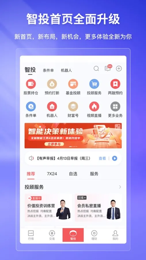 华宝智投(前身为华宝钱钱炒股)是华宝证券创新出品的一款智能股票交易工具。为了满足广大股民的新需求,创新设置了止盈止损、价格条件、网格交易、时间条件等10大智能交易条件单功能,用户只需要提前简单设置好条件,系统就可实现云端实时盯盘,在条件触发时智能下单。华宝智投是业内专注于为个人投资者解决股票智能交易难题的APP。