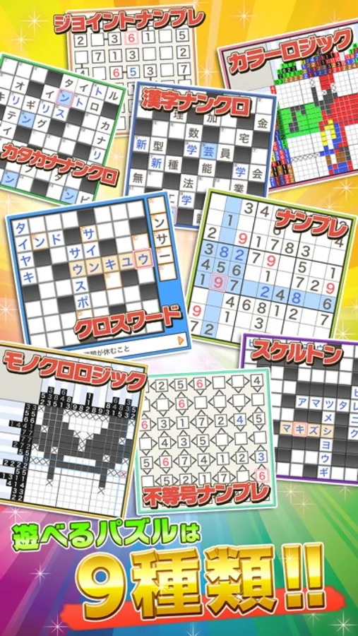 定番パズルとしておなじみのクロスワード、スタンダードナンプレ(数独)、不等号ナンプレ、ジョイントナンプレ、モノクロロジック、カラーロジック、漢字ナンクロ、カタカタナンクロ、スケルトンの全9種類が1つのアプリで遊び放題です。