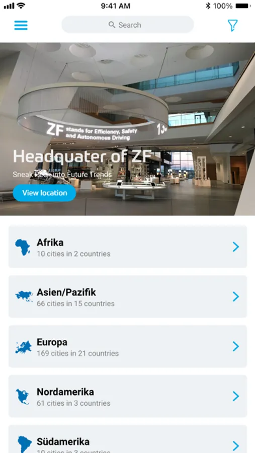 Location Services are used for locating users (only locally) on the inbound mapsThe ZF Locations App provides an overview of all ZF locations worldwide. It is easy to find the locations via an intuitive list and map navigation. The detailed view of a location offers the location’s address, contact information and, if available, directions and location plans. Individual locations can be displayed on a map using geolocation. It is possible to start navigation to the location immediately. The app does not need a data connection. Only the location indicator on the navigation map requires a mobile data connection. Supported devices are iPhones, iPads and iPods. Supported languages are English and German.