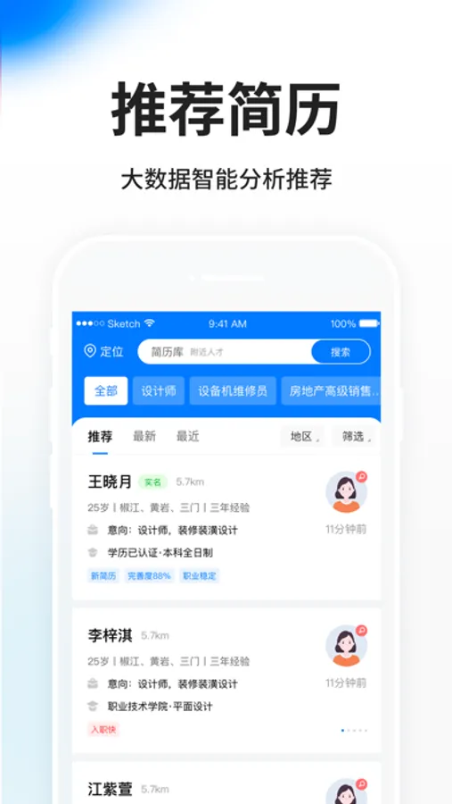 -找附近人才:直观的方式找到附近的人才,特别适合企业招聘行政或财务岗位的人才