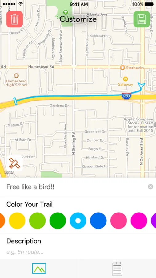 AnyTrail offers a collection of features that you can use to make your trails truly personal. Not only can you add photos to your trails, but now using AnyTrail you can also add videos, and even note snippets as well! What's more, choose from a collection of delightful colors, so that your trails can be drawn in a color you like. Be creative, it's all about you!