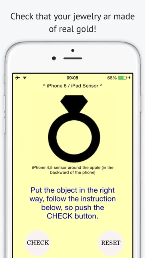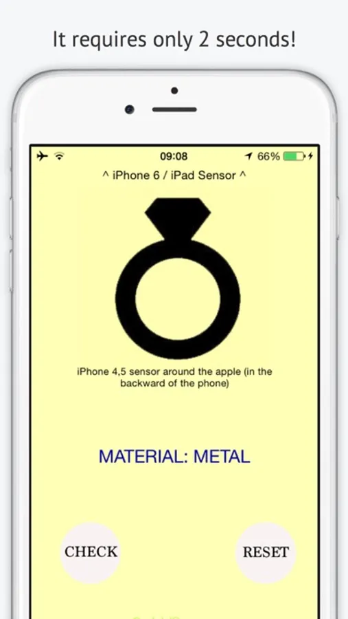 - Place the phone on top of the material to be analyzed (according to the appropriate location on the sensor, on iPad / iphone 6 in the upper end, on the other iPhone the sensor is AROUND THE APPLE, in the backward of the phone) and press "CHECK". You will see in the video composition of the object that you place in question!