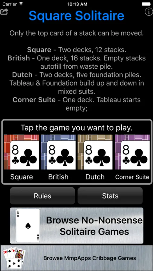 Four oddball games of solitaire. Free to play. No in-app purchases.