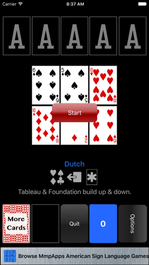 DUTCH - Unique foundation has 5 stacks. Both the foundation and the tableau build up and down.