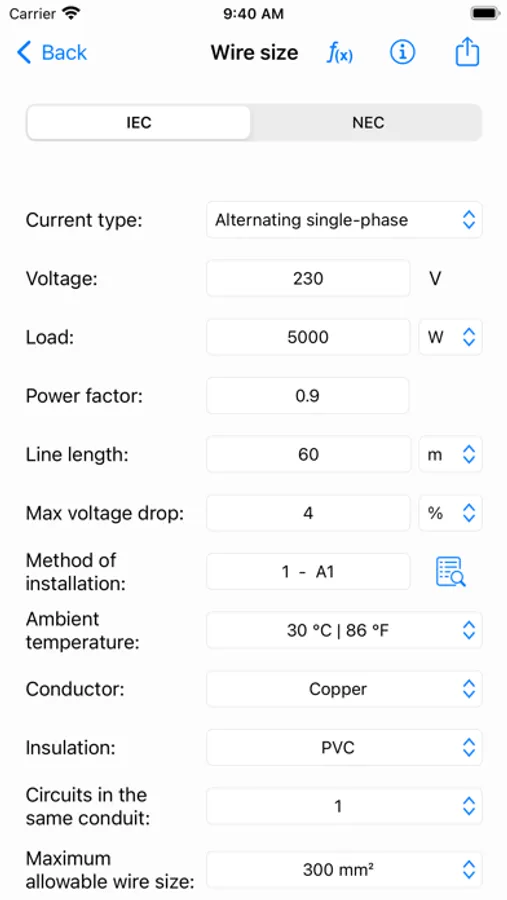 Wire size, voltage drop, current, voltage, active / apparent / reactive power, power factor, resistance, Maximum wire length, Current carrying capacity of insulated conductors / bare conductors / busbar, Conduit fill, Sizing the circuit breaker, Admissible let-through energy of the cable (K²S²), Operating current, Reactance, Impedance, Power factor correction, Power factor correction of transformer MV/LV, Capacitor power at different voltage, Earthing system, Short circuit current, Conductor resistance, Calculation of the cable temperature, Power losses in cables, Neutral current, Temperature sensors (PT/NI/CU, NTC, Thermocouples…), Analog signal values, Joule effect, Fault current of strings, Risk assessment of overvoltages with atmospheric origin.
