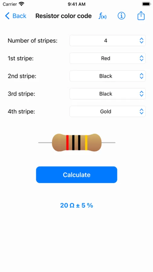 Resistor / Inductor color code, Fuses, Sum resistors / capacitors, Resonant frequency, Voltage divider, Current divider, Zener diode as voltage stabiliser, Resistance to reduce voltage, Resistance for led, Battery life, Primary/Secondary winding of transformer, Antenna length, CCTV Harddrive/Bandwidth calculator.