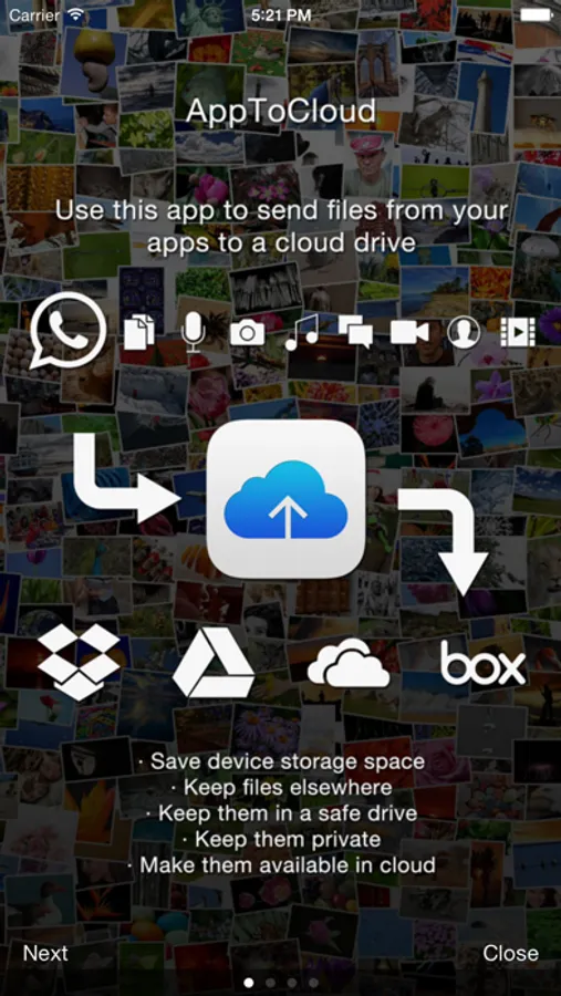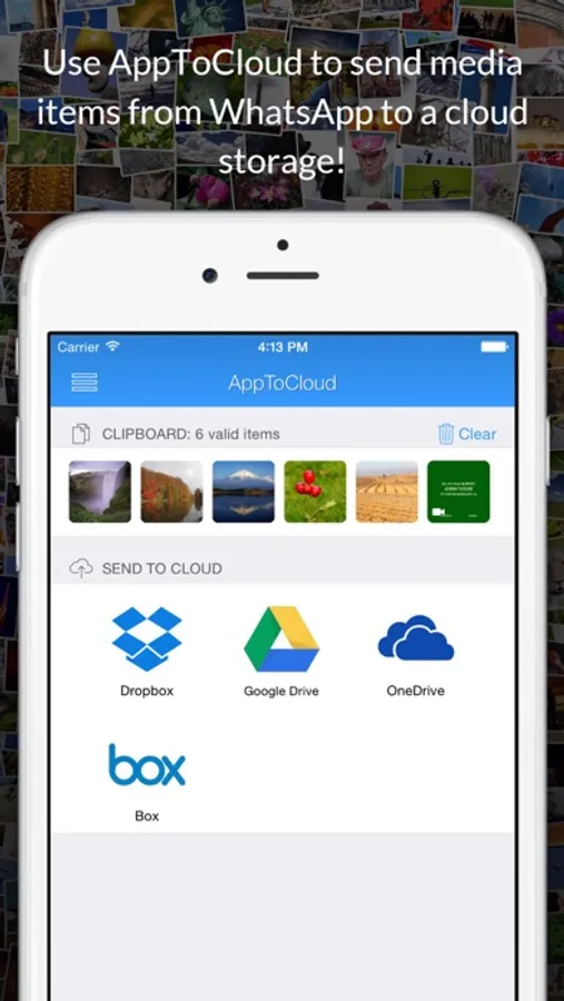 This app is new tool to easily upload files to cloud services like Dropbox, Google Drive and others. A must-have app for users looking to send files from WhatsApp directly to cloud drives, in order to save device storage or to have these files accessable thru cloud or even to keep them in a safer, personal place.