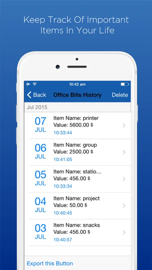 3. Value - Create a ‘Value’ button to record any items that contain value, like bills paid. Record the item name and how much you paid, and see a summary of your spending.