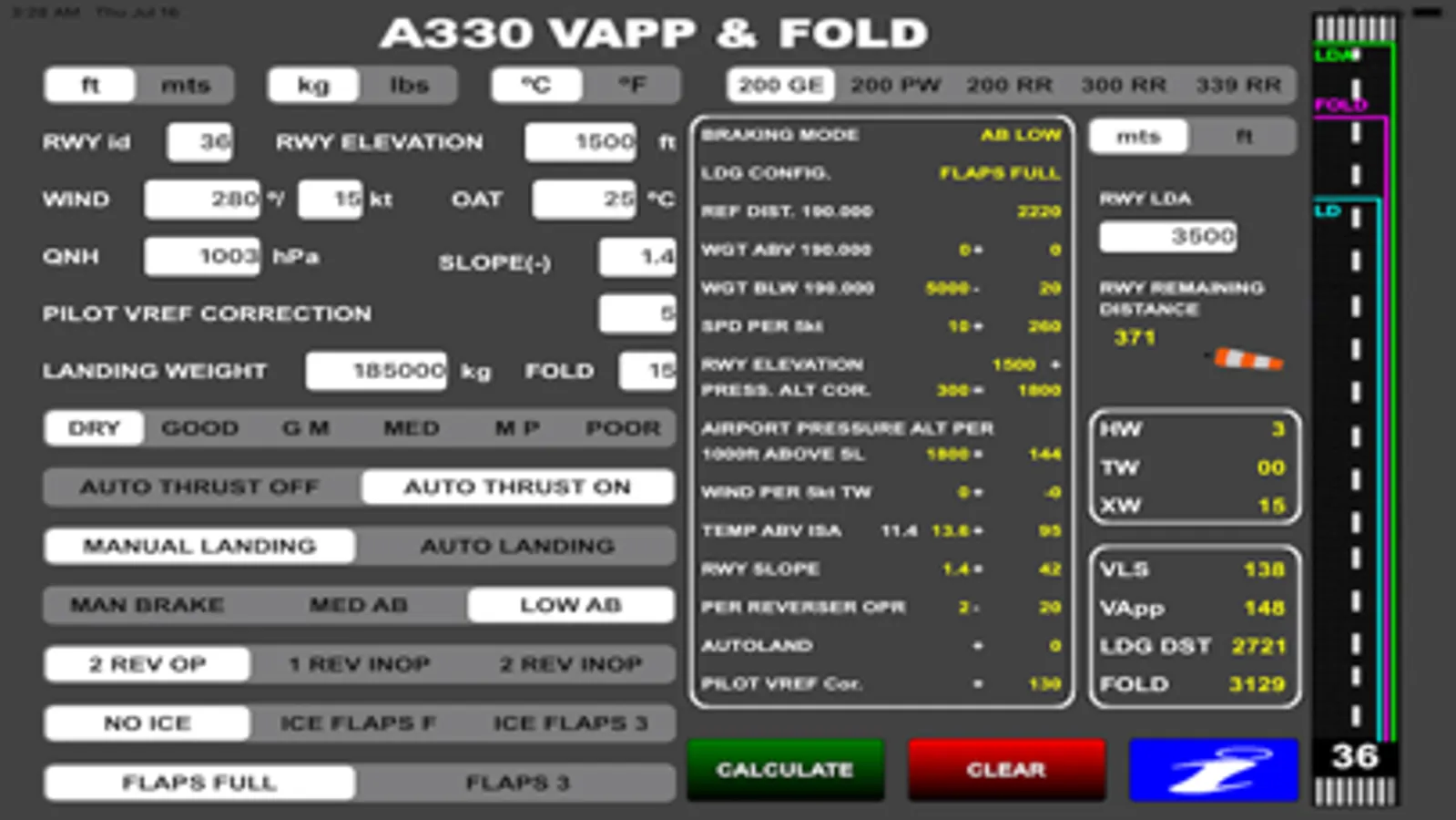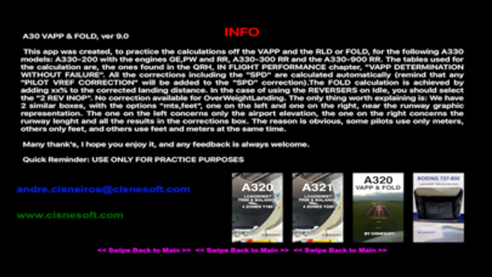 This app was created, to practice the calculations off the VAPP and the RLD or FOLD, for the following A330 models: A330-200 with the engines GE,PW and RR, A330-300 RR and the A330-900 RR.