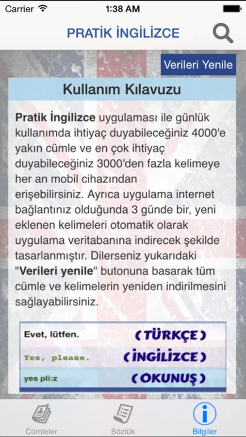 İngilizceyi bilmiyor musunuz? Artık bunu dert etmenize gerek yok. Özenle seçilmiş ve günlük konuşmalarınızdaki tüm ihtiyaçlarınızı karşılayacak kelime ve cümlelerden oluşan "Pratik İngilizce" uygulamamız sizler için yayında. Üstelik ilk kullanım sonrası güncel verileri aldıktan sonra internet bağlantınız olmasa da çalışabilecek şekilde tasarlandı.