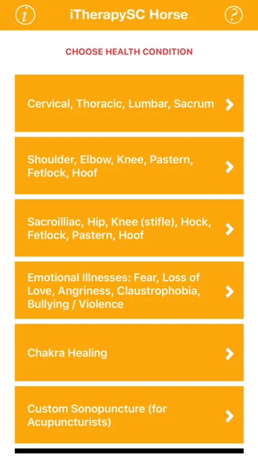 Cervical, Thoracic, Lumbar, Sacrum, Shoulder, Elbow, Knee, Fetlock, Pastern, Hoof, Sacroiliac, Hip, Knee(stifle), Hock, Fetlock, Pastern, Hoof, Emotional Illnesses (Fear, Loss of Love, Angriness, Claustrophobia), and Chakra Healing.