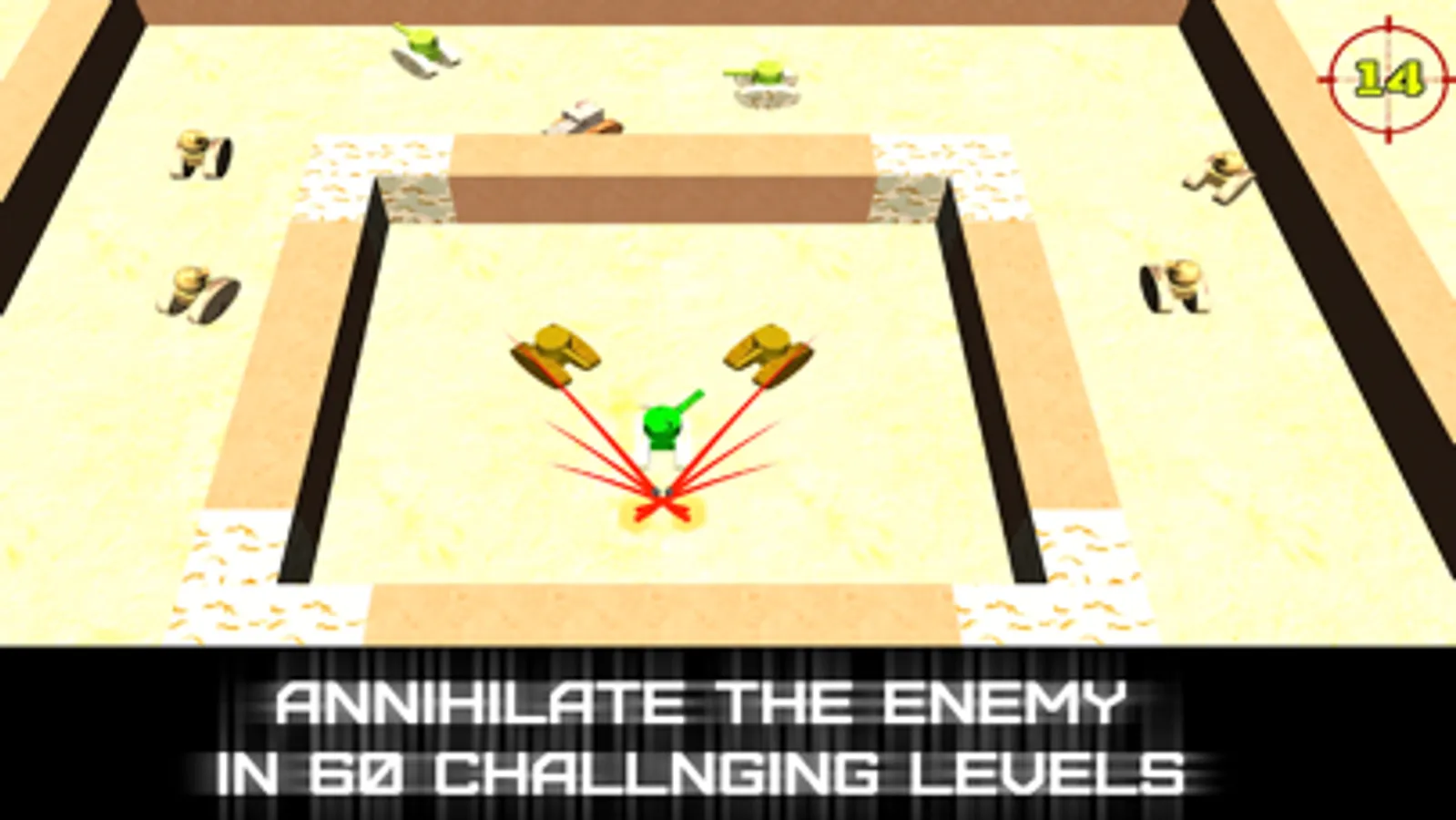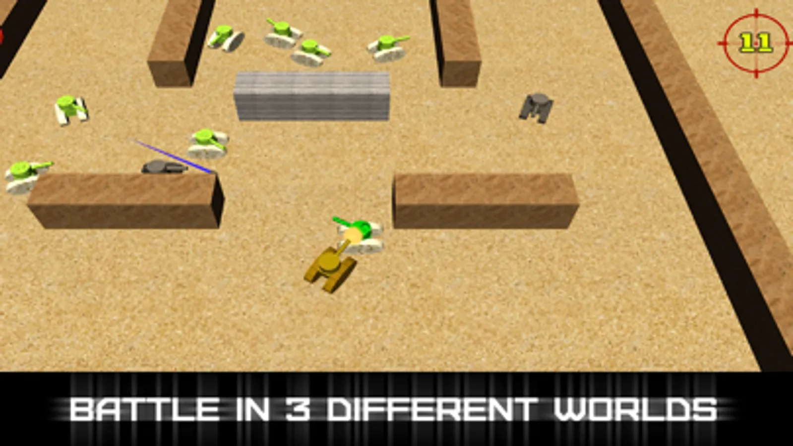 Fast paced and challenging battles as you face down overwhelming numbers of enemy tanks. Enemy tanks can shoot with regular guns, cannons, heat seeking shells, and the dreaded deadly three-gun tank. Includes 60 challenging levels of desert tank battles with 3 different worlds.