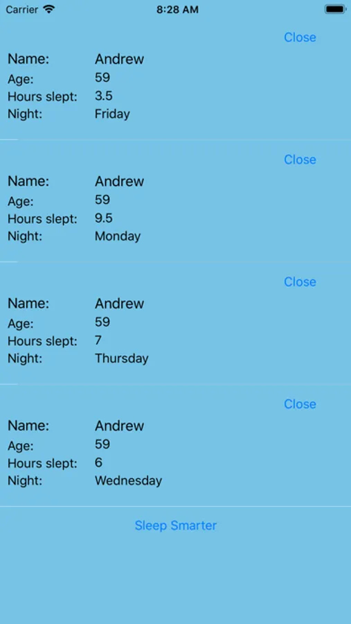 ....Sleep Smarter... An App that shows you how much of your life you or your children spend sleeping. Just enter name, age, hours slept and what night, then press the sleepy head button. Check your Hours slept and Age then press the sleepy head button. Read the popup and press "Close" and read how many hours you sleep within a year and life. You can then press the "Facts" button choose either Sleep Disorders or Perfect Sleep and you will be taken to a website where you can read all about your sleep habits. Try out the timer when you take a nap or go to bed to track the amount of time you slept. Press the start button when you go to sleep and when you wake up press the stop button, and take note of the amount of time you slept, then press the close button, tap New User and fill in all fields then tap Sleepy Head.