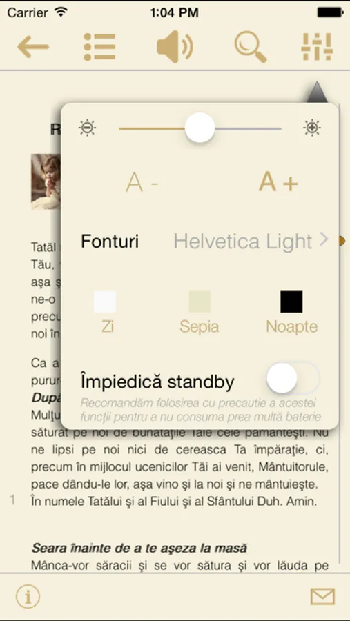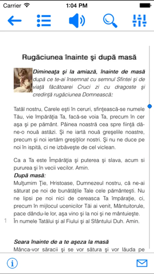 Aplicatia stie sa citeasca textele in romaneste, insa nu recomandam folosirea acestui feature pentru acatiste, rugaciuni.