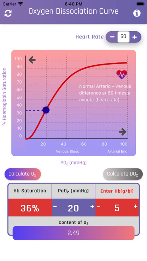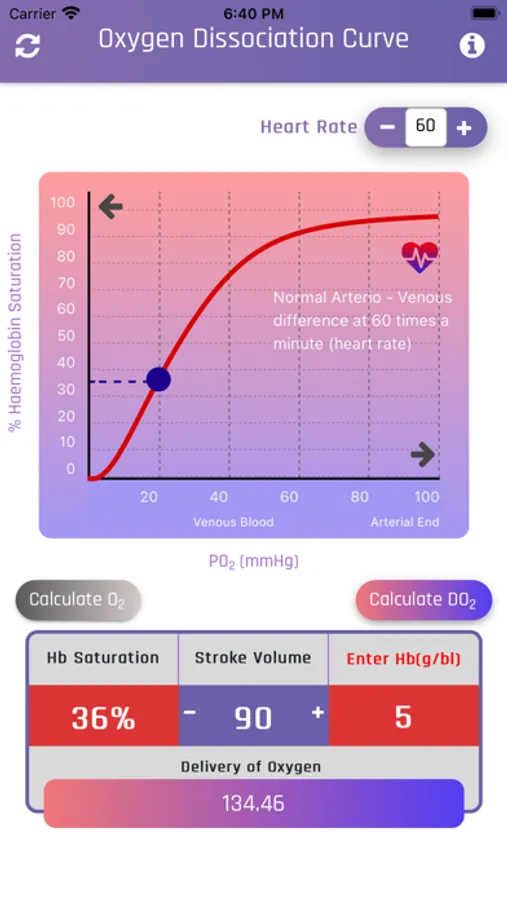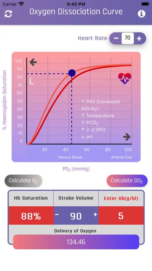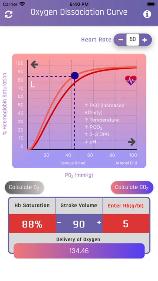The app's normal sigmoid curve can be shifted to the right or left, indicating the decreased and increased affinity of hemoglobin to oxygen, respectively. The app also displays the causes for the shift in the curve, helping users understand the factors that affect hemoglobin saturation. The application shows the fall in saturation of hemoglobin as the blood moves from the arterial to venous end, and the oscillating cursor indicates the heart rate which can be changed. The app displays both arterial and venous saturation and provides P50 value, which denotes the partial pressure of oxygen at which hemoglobin is 50% saturated (marked in the application).