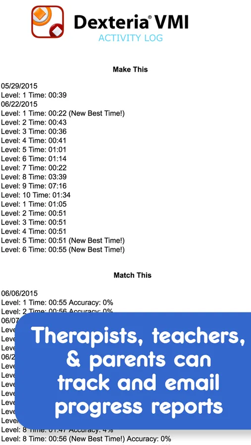 Occupational Therapists and Teachers can also use the app for patient/student assessments. Skills covered include: visual figure-ground, visual discrimination, copy-build, visual-motor, and visual-perception.