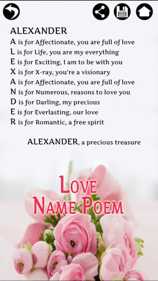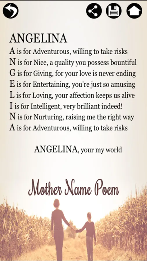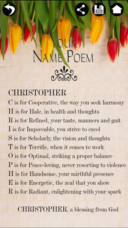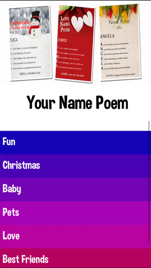 Make a fun Name Poem with this free app. An acrostic name poem - totally unique for your name. This is not available on any other app. Make poems for your friends, pets and family. Share your name poems on Whatsapp, Facebook and other apps.