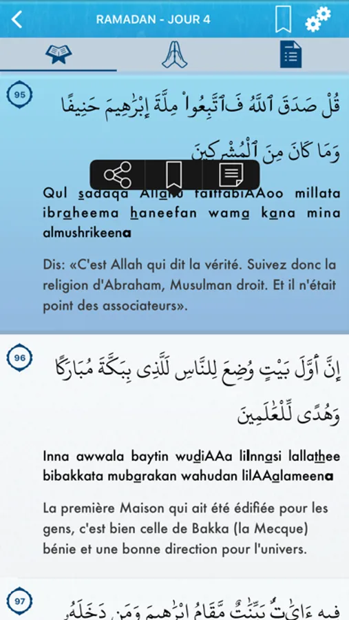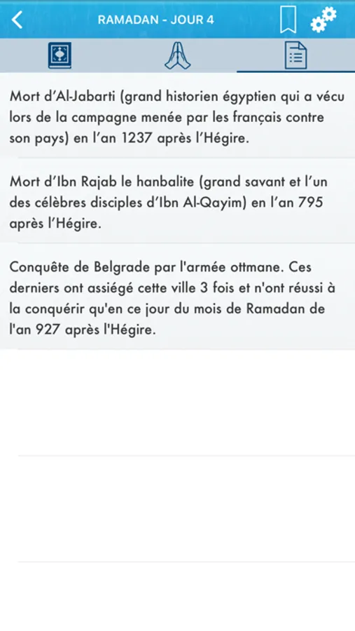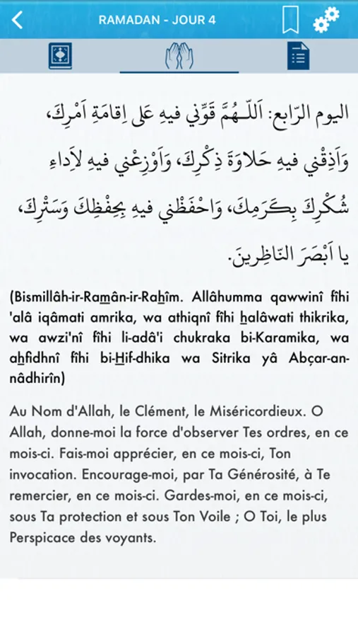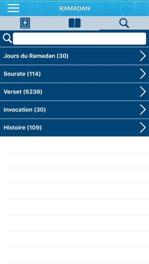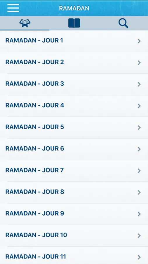=> L'application est divisée en 30 chapitres : chaque chapitre correspond à l'activité d'une journée du mois de Ramadan