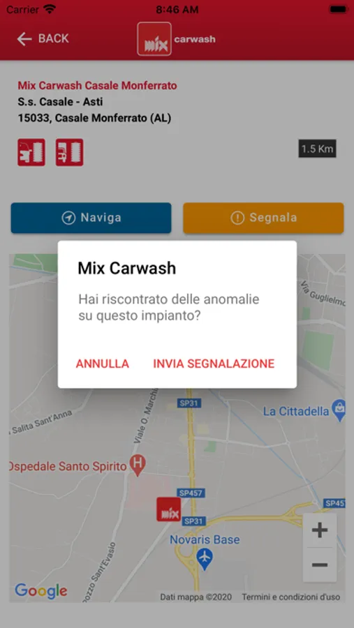 Dalla scheda dell'autolavaggio è possibile visionare su mappa la sua posizione ed avviare la funzionalità di navigazione.