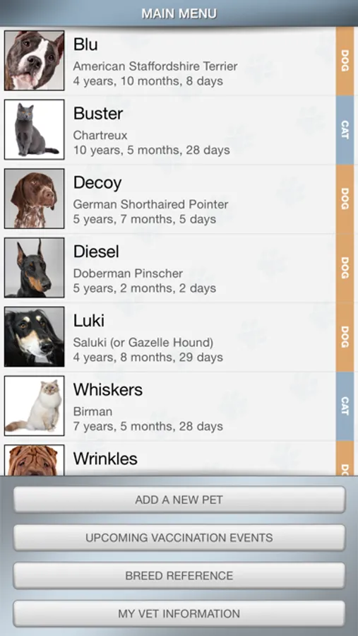 My Pet Project is an elegant, yet simple solution to help you keep track of your best friend's medical details. Use My Pet Project to have quick access to your favorite pets microchip, rabies and county license numbers, as well as keep an eye out for any upcoming vaccination dates. My Pet Project also allows you to keep a record of your pets medicine routine as well as any allergies that might put a damper on your furry friends disposition. My Pet Project contains a breed reference with details covering over 200 cat and dog breeds, including how they rank in relation to common questions (ie, energy level, affection level, grooming needs, etc.) as well as general medical notes such as major and minor concerns, and suggested tests.