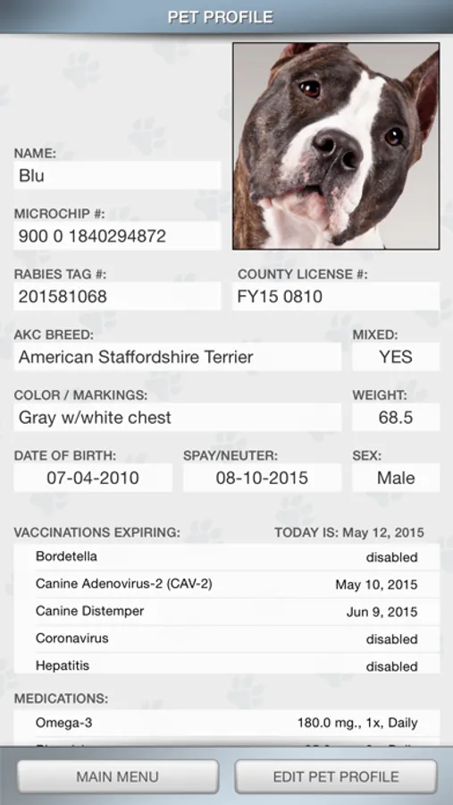 • Name, Microchip number, Rabies number, County license number, Breed, Markings, Weight, Date of birth, Date of spay/neuter and Sex
