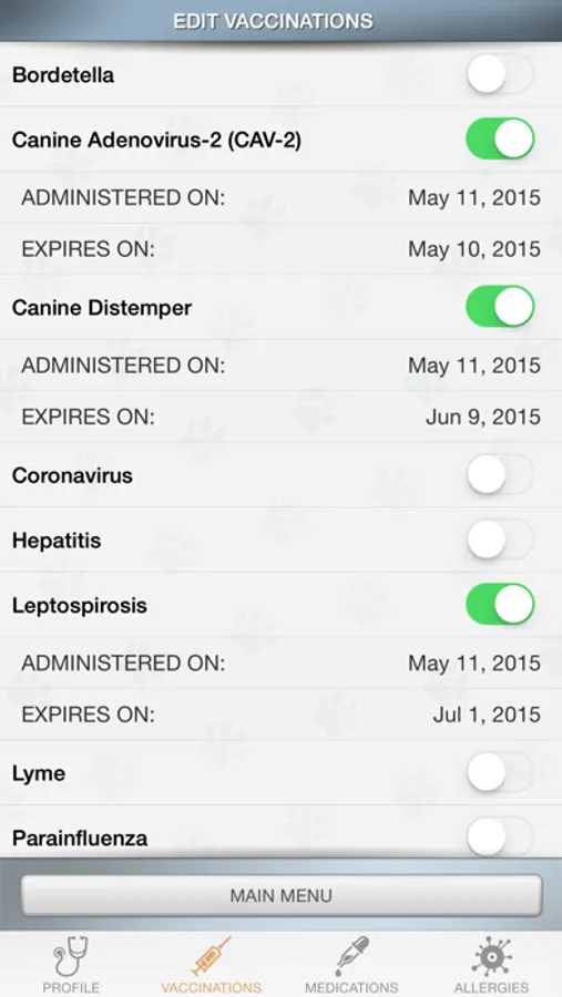 • Canine vaccinations: Bordetella, Canine Adenovirus-2 (CAV-2), Canine Distemper, Coronavirus, Hepatitis, Leptospirosis, Lyme, Parainfluenza, Parvovirus, and Rabies