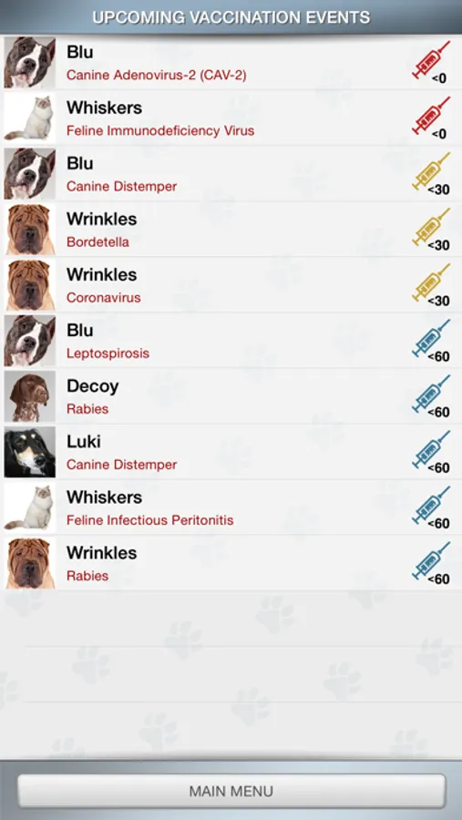 • Vaccination event reminder, detailing vaccination dates under 60 days, under 30 days, and expired.