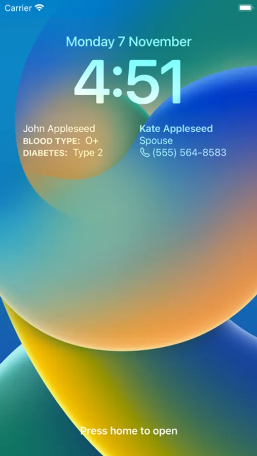 Lock Screen widgets are available on iOS 16. There are rectangular widgets for viewing an Emergency Contact or up to three Personal Details items. There are also circular and rectangular widgets which just open the app (this requires unlocking the device).