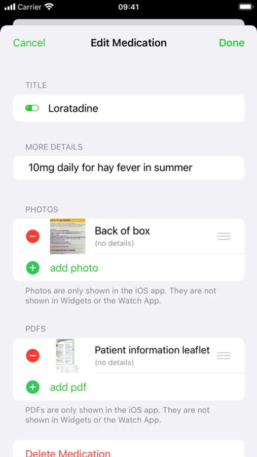 Note: for space and usability reasons, photos and PDFs are not included in the Watch App or Widgets.