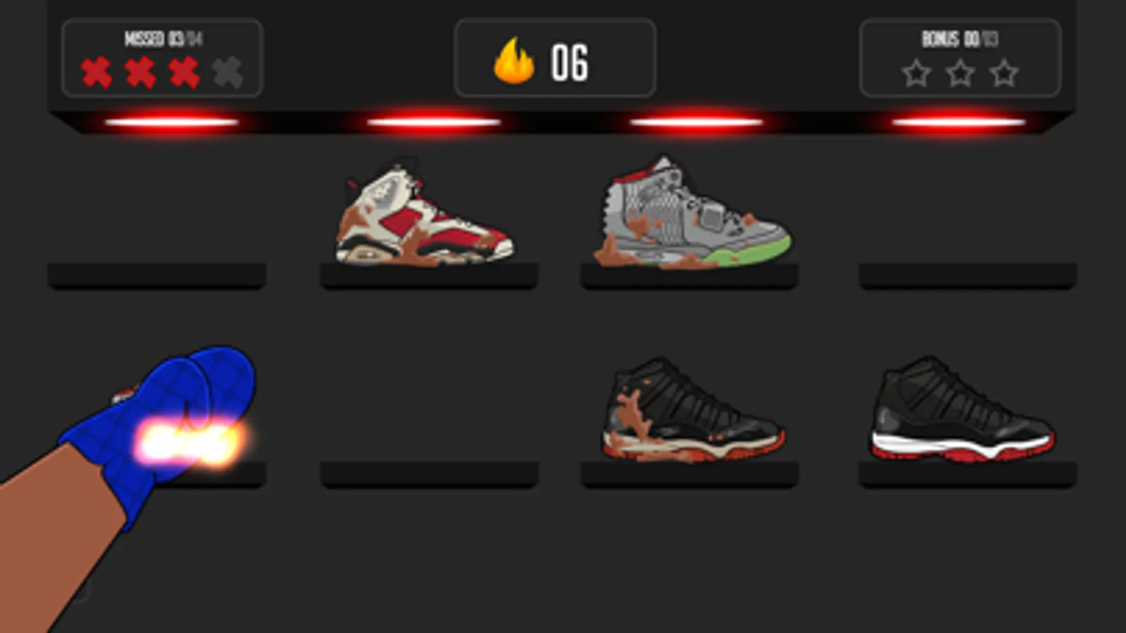 Roast (Tap) dirty sneakers and avoid clean sneakers. Simple game play but super addicting. Score high points and tapping the bonus shoes to get 3 stars and enter the bonus round where points are higher. Get special shoes like Freeze and Fire that temporarily change the pace of the game but increase your score. Tap the real ugly “What are those?:” shoes to earn 5pts every time.