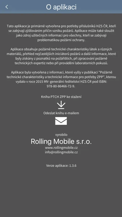 Aplikace nabízí čtyři informační části. První část s názvem PTCH nabízí abecední seznam látek a materiálů s uvedením jejich základních požárně technických charakteristik, tak jak byly získány z odborné literatury nebo byly změřeny při laboratorních zkouškách. Aplikace v druhé části nabízí přehled základních a nejčastěji se vyskytujících iniciátorů požárů. Třetí část obsahuje doplňující informace z oblasti doprovodných jevů požáru, bezpečnostního značení, označování nebezpečných látek při silniční přepravě a informace definující povahu látek formou H a P vět. Čtvrtá část je věnována základům z oblasti výbušných atmosfér a protivýbuchové prevence. Mobilní aplikace je primárně určena pro vyšetřovatele požárů, může však také sloužit každému, kdo se zabývá požární ochranu.
