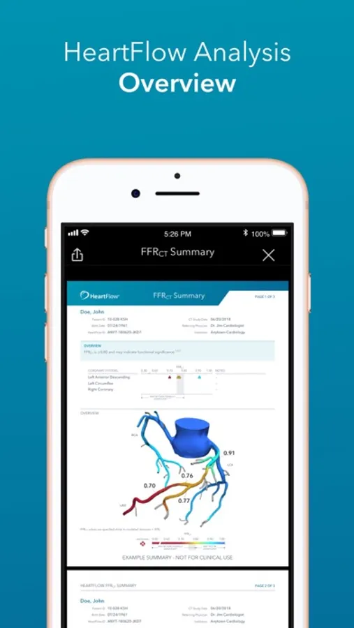 The HeartFlow® mobile app is a convenient way for clinician customers to see the status of their patients’ HeartFlow FFRct Analyses. Quickly scan a list of patients in your institution with the HeartFlow Analysis and view patients’ personalized 3D models with FFRct values.