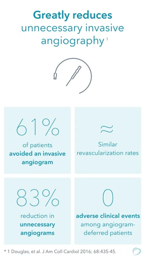 • Improves clinical outcomes through earlier detection of CAD without intervention or adverse events - 83% reduction in unnecessary angiograms*