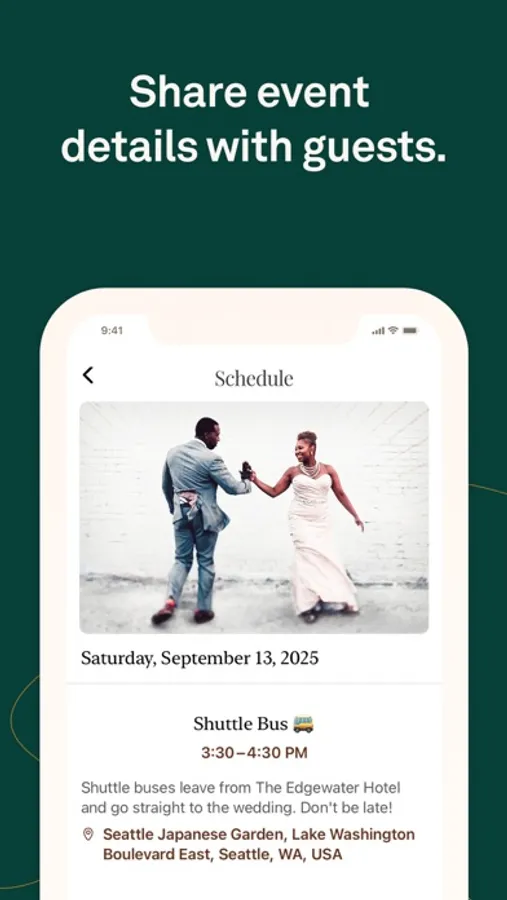 Ride-sharing integrations make it easy for guests to get to your wedding events, so nobody is late to your marriage ceremony.