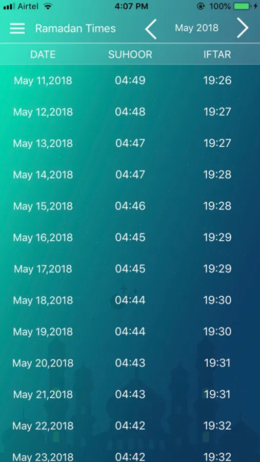 - App shows whole months suhoor and Iftar time in table fromat.