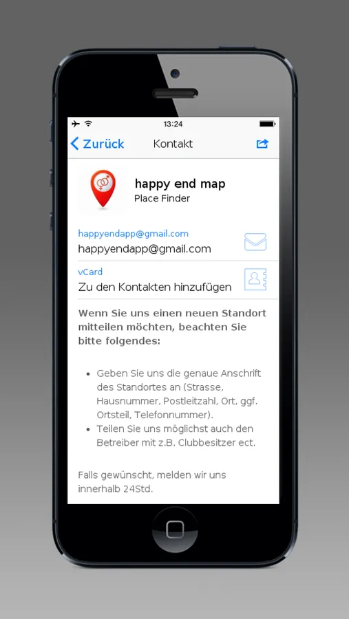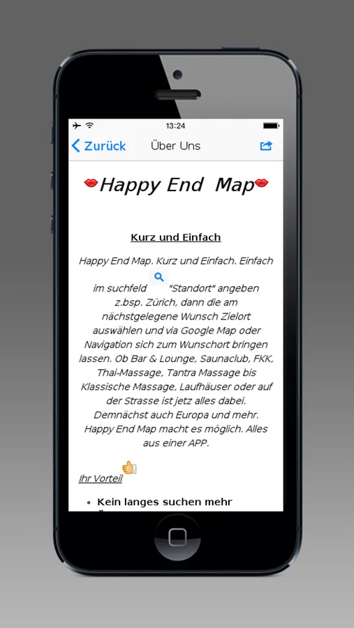 Happy End Map. Kurz und Einfach. Einfach im suchfeld "Standort" angeben z.bsp. Zürich, dann die am nächstgelegene Wunsch Zielort auswählen und via Google Map oder Navigation sich zum Wunschort bringen lassen. Ob Bar & Lounge, Saunaclub, FKK, Thai-Massage, Tantra Massage bis Klassische Massage, Laufhäuser oder auf der Strasse ist jetz alles dabei. Demnächst auch Europa und mehr. Happy End Map macht es möglich. Alles aus einer APP.