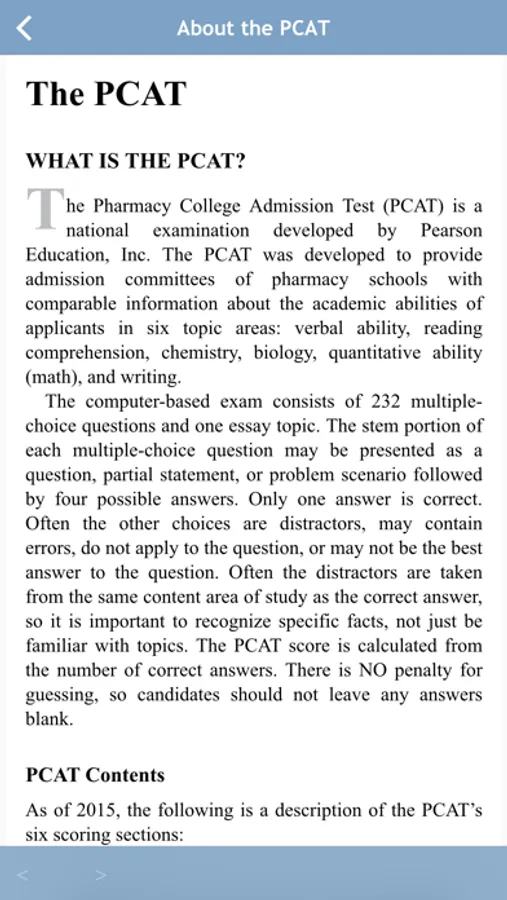 Initial download of the app delivers 10 complimentary multiple choice questions in each topic for a total of 50 questions. By purchasing the expansion pack in the app, you will gain access to over 850 questions and answers. So whether you’re looking for an overall review or need to hone in on problem areas, this app is all you need to succeed on the PCAT. Flag questions as you go along and track your progress using the detailed analytics available within the app including exam history, strength by topic, and overall progress.