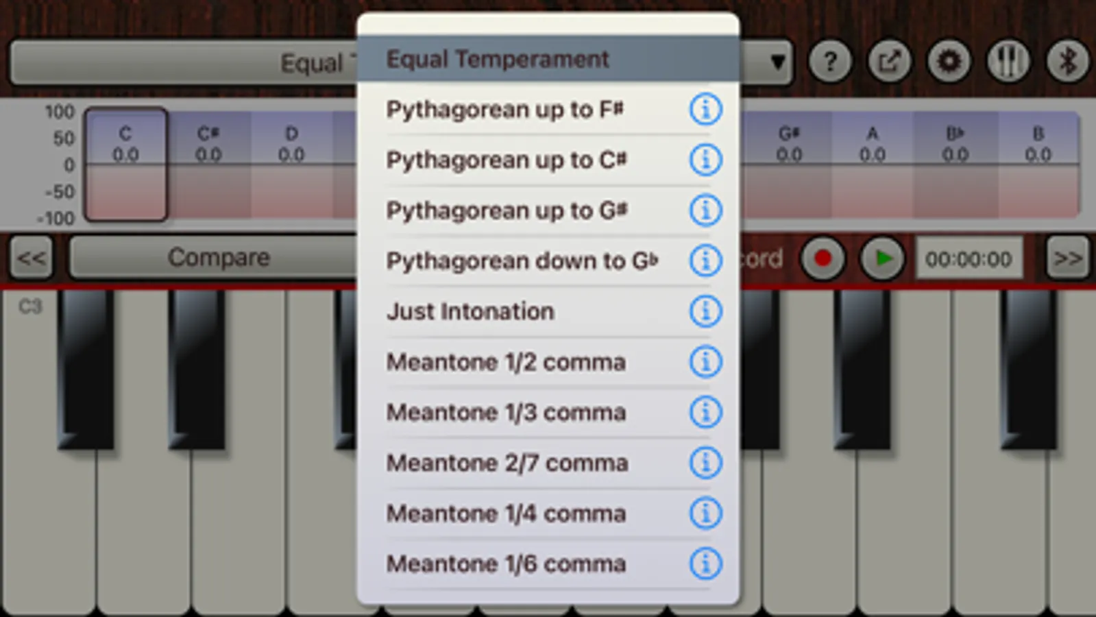 Temperaments includes twenty six temperaments in addition to Equal Temperament, with both meantone and unequal-interval types. You can switch back to Equal Temperament instantly just by pressing a button for instant comparison - even while notes are sounding. You can even change to an entirely different temperament instantly, any time, even in the middle of a performance.