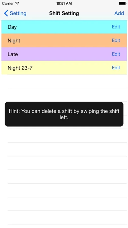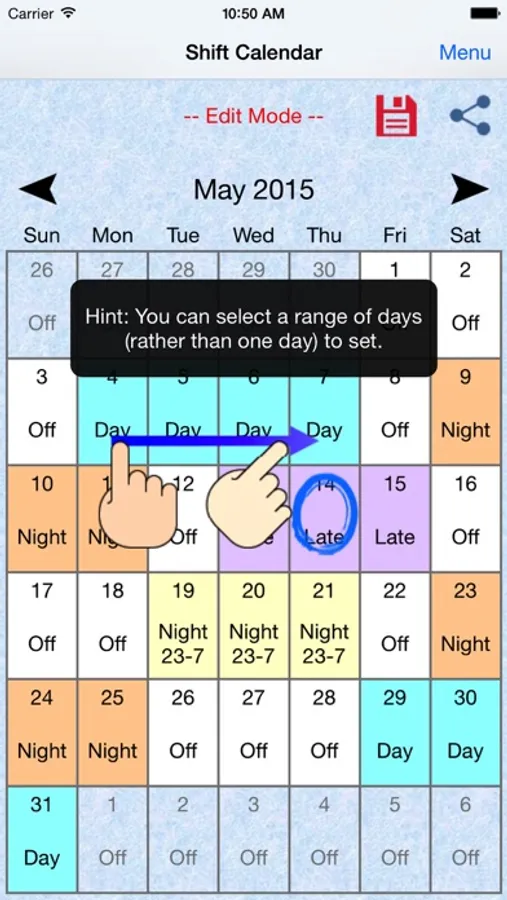 This app is designed for all hard-working shift workers. You can add customized shifts easily. The major feature of this App is 'Easy to Use'. When editing your shifts, you can select a range of days (rather than one day) to set. Thus, you can set your schedule (roster, planner) in few seconds. Then, you can send your schedule (roster, planner) to your friends via email or other apps by clicking one button.