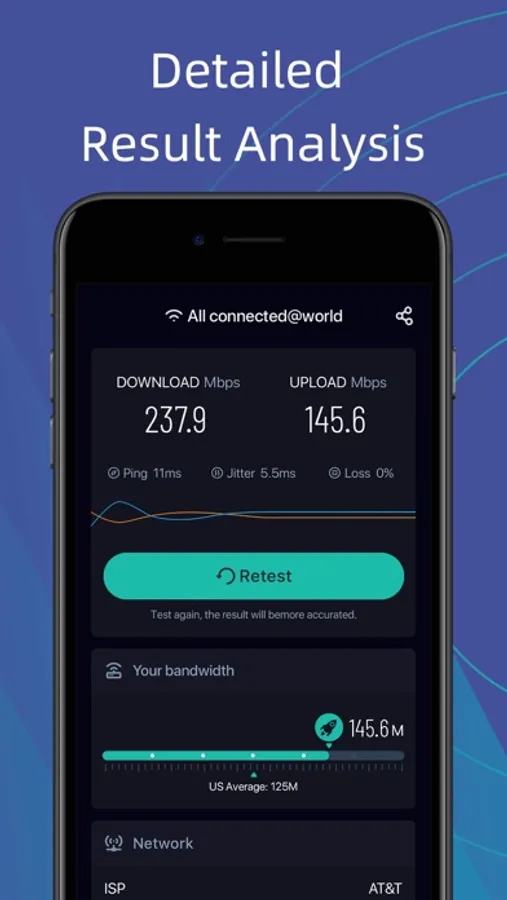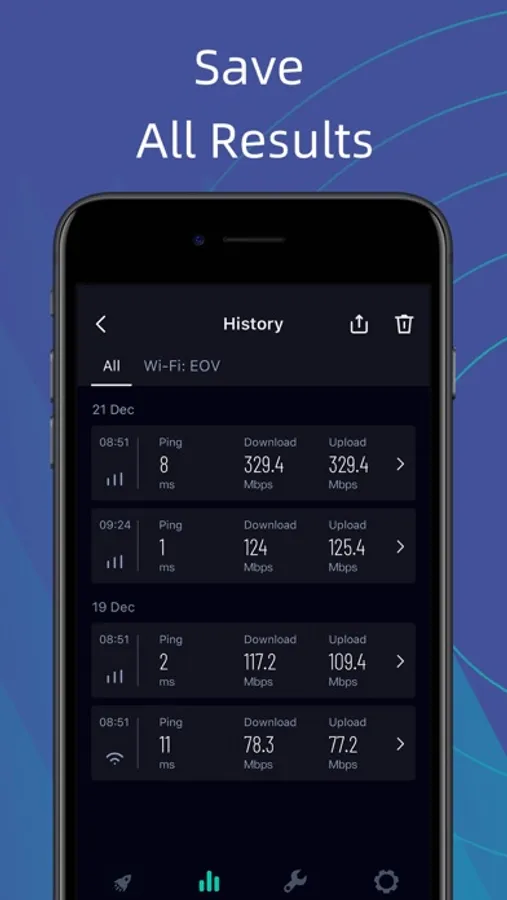 - One- tap to test speed for 2G, 3G, 4G, 5G, DSL, ADSL, and Wi-Fi.