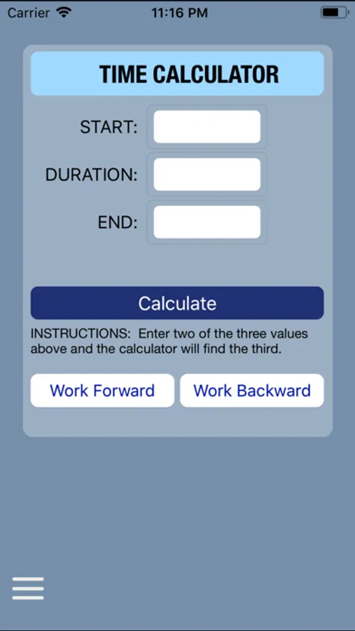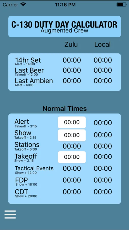 This app will quickly help you calculate all applicable duty day restrictions in both Zulu and Local time zones. Simply enter the Alert, Show or Takeoff time and all Vol-3 restrictions will be instantly calculated for you. No more complex calculus at the end of your duty day.