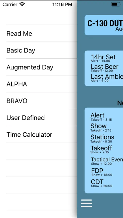 NEW: You can now add your own timeline to the app. Add your personal or squadron timeline to the latest addition. The tab can be tied to other calculator pages or work as a standalone tool for you planning your duty day.