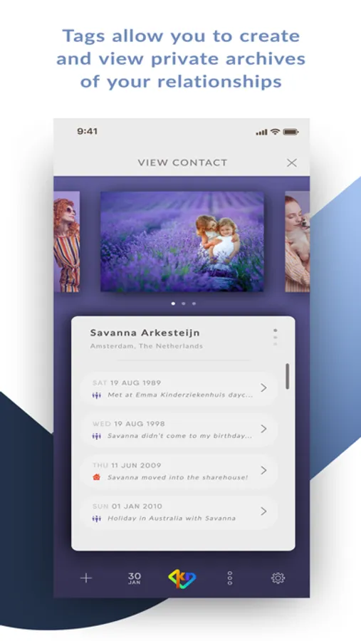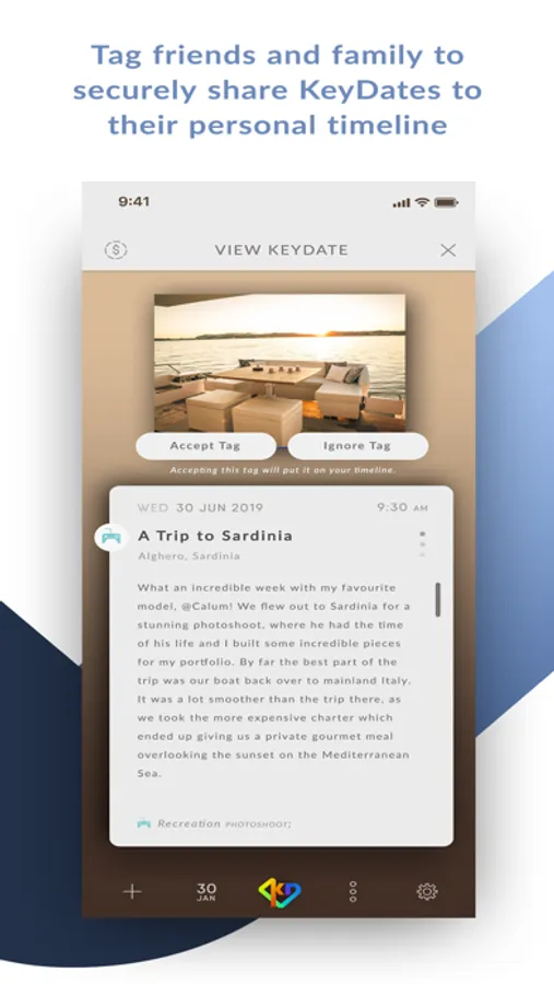 The secure, internal Tagging functionality allows you to privately send a static memory to another user's application with a one-time notification - no chat, comments or private messaging. Accepting the Tag within the app will put a copy of the memory onto the recipient's KeyDates Timeline, and enable the ability to view all events that have been shared with a the other user in a beautiful collated view.